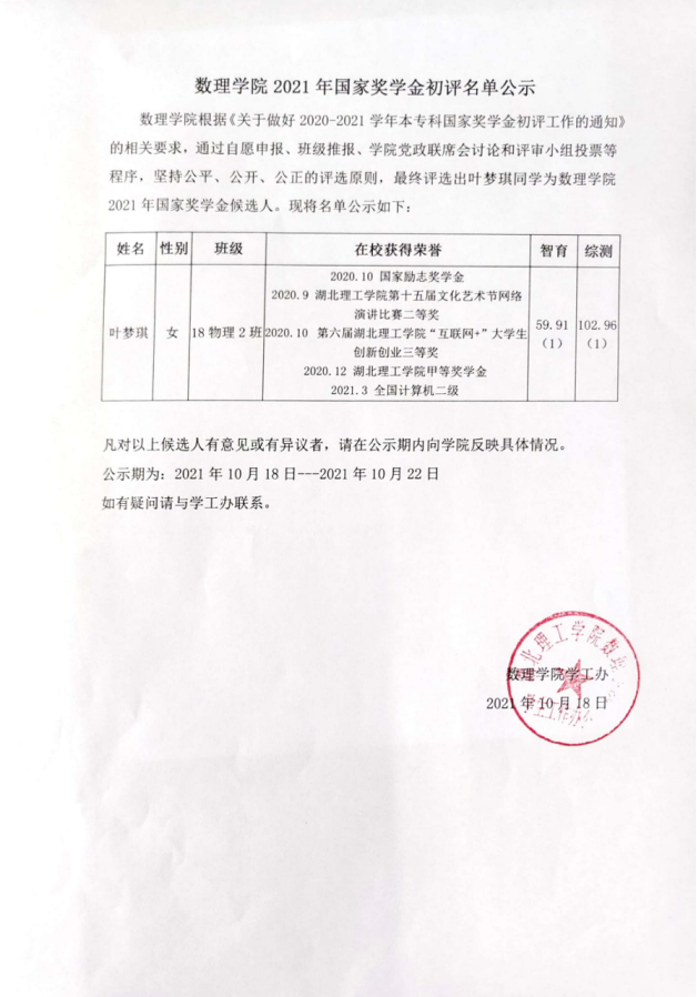 2021数理学院国家奖学金初评名单公示