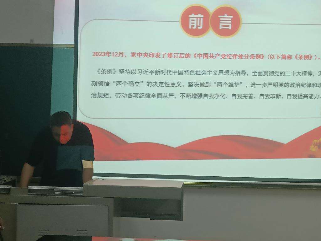 随后,胡传峰同志聚焦新修订的《中国共产党纪律处分条例》,围绕“加强党员党纪教育的重大意义”、“党纪处分的重要规定”、“新修订纪律处分条例的亮点”和“将遵规守纪刻印于心外化于行”四个部分向教师党员们进行深入阐述,强调要把遵规守纪刻印在心、内化为言行准则,真正做纪律上的明白人,持续巩固深化风气建设成效,以严的基调一体推进不敢腐、不能腐、不想腐。