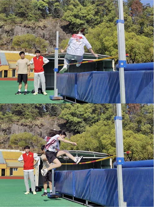 在跳高比赛的赛场上,同学们摩拳擦掌,不断地做热身运动。一道道灵活的身姿跨越空中的黄杆,引起一声声惊呼。