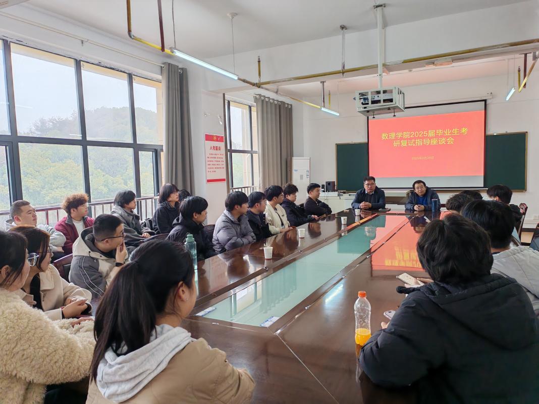 (本网消息)2月28日下午,数理学院在智慧大楼三楼会议室召开“2025届毕业生考研复试指导座谈会”。经理余宏生、副书记胡先凯、熊宏伟教授出席会议,学院30余名考研员工到场参加。会议由经理余宏生主持。