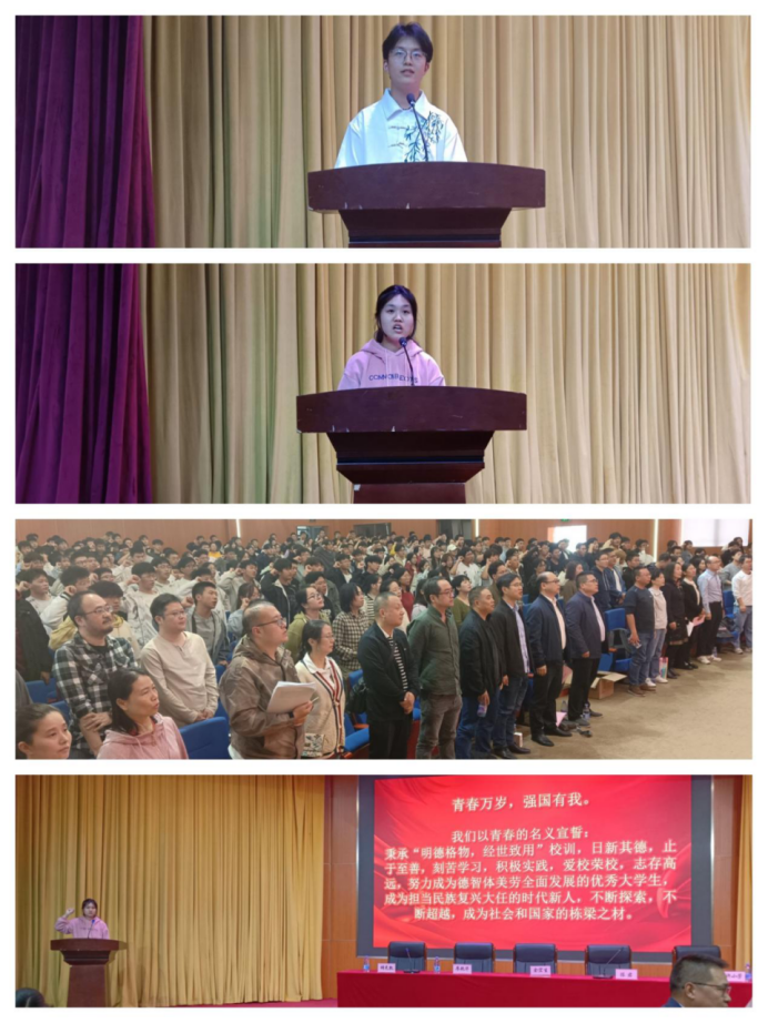 葛正阳同学代表老生,杨婧琳同学代表2024级新生分别进行了发言。杨婧琳同学带领全体新生作了“青春万岁,强国有我”的集体宣誓。
