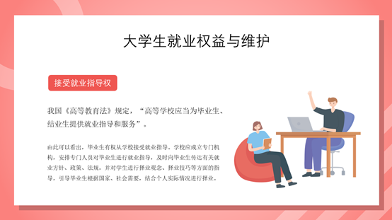 第二部分则是告诉同学们在求职过程中保护好自己的人身安全和财产安全,多听,多看,遇到相关问题,要敢于向有关部门反映;在签订协议书前一定要对其内容反复斟酌,方可落笔。最后一个板块则是在校老员工享有自由选择职业的权利,学校应对其进行帮助,提供有效信息。毕业生有全面获悉用人单位信息、了解用人单位的工作环境、福利待遇、发展前景等情况的权利。在求职之前应该进行充分了解。