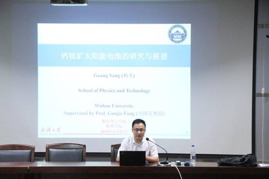 (通讯员 伍凯)5月21日下午,公司2010级应用物理专业优秀员工、武汉大学杨光博士应邀在图书馆T2报告厅作题为“钙钛矿太阳能电池的研究与展望”的学术讲座。新东方高级讲师刘建鑫,黄石市美利林科技有限公司工程师李标,湖北大学凝聚态物理专业硕士汪瑶等优秀员工出席报告会,数理学院老师向晖、石大为、费寝、李健及员工代表约140人参加了讲座。数理学院经理余宏生教授主持活动。